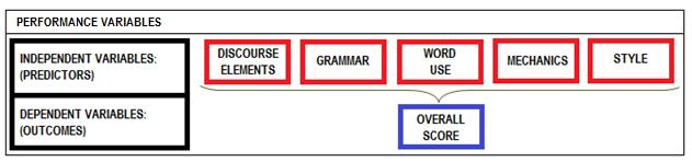 Based on a review of the relevant literature and an assessment of exemplar software systems already demonstrated to the Working Group, a visual representation of the writing construct as it is represented in many applications is presented here. In the model, discourse elements, grammar, word use, mechanics, and style represent the independent (or predictor) variables that contribute to one dependent (or outcome) variable, such as an overall score. The outcome (criterion) variables for vendor products might include the following: an assessment of strength of organization and development, writing productivity, error rates, types of errors, scores from traits, and a holistic (or composite) score. Those variables may be applied both to pre-writing tasks, as well as final writing submissions. Following the selection of the participating products, we will investigate how these (or other) variables may apply (and the data that can be extracted from those selected systems).